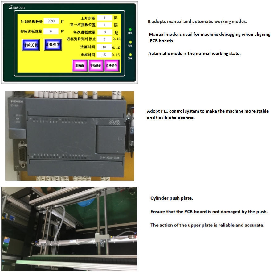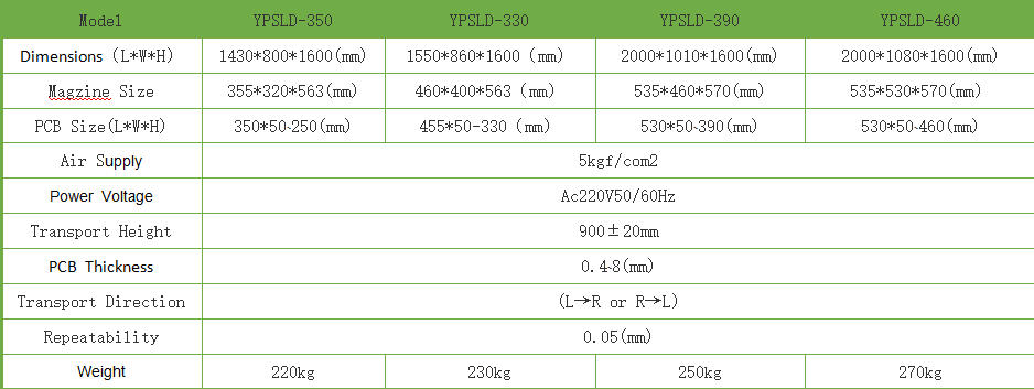 1.PCB automatic loading machine to achieve SMT process automatic precision production, and adapt to other similar PCB board products before and after the mechanical loading and unloading; 2.The automatic loading machine reduces the oxidation of the pad brought by manual loading, and saves a lot of human resources, which is the outstanding feature of this machine. 3.Automatic loading machine adopts imported PLC control, high degree of automation, for the stable work of the machinery escort; 4.With the function of setting a single rise height, when the PCB has a welded component height can be set a single rise number, the maximum interval of 10; 5.The frame is made of thickened patent aluminum profile, with superior material selection, strong and durable; 6.The automatic loading machine adopts high precision SMC cylinder push rod imported from Japan to ensure the reliable and correct operation of the loading plate; 7.This set of automatic loading machine is used for the automatic loading and unloading of the machine before and after the machine, with automatic lifting/automatic counting/automatic loading and unloading of the material frame and fault alarm functions, which is an essential equipment for realizing on-line/on-line automation. 8.Various sizes of PCBS can be made according to different sizes of customers.PCB automatic loading machine Technical Parameters:
